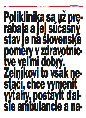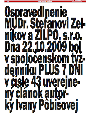 Týdeník se musí omluvit za to, že v roce 2009 vyjádřil pochybnost nad tím, zda bývalý poslanec vládní Slovenské národní strany Štefan Zelník nevyužil svých politických kontaktů, aby získal dotace z eurofondů pro své podnikání. Omluvu musí zveřejnit ve stejném písmu, v jakém byl titulek článku. „Je to výsměch naší justice,” komentoval šéfredaktor. Zároveň v omluvě musí zopakovat celý článek ve fontu titulku. Zatímco původní článek zabral 2,5 strany, omluva vychází na 54 stran.