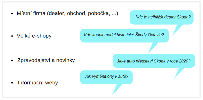 Na hlasové vyhledávání jsme připravovali klienta Škoda Auto a v souvislosti s local businessem jsme se zamýšleli nad konkrétními dotazy, na které by se uživatel mohl hlasového asistenta vyptávat. Jsou to například otázky typu ,Kde je nejbližší servis Škoda?‘ nebo ,Jaká je otevírací doba dealera?‘.