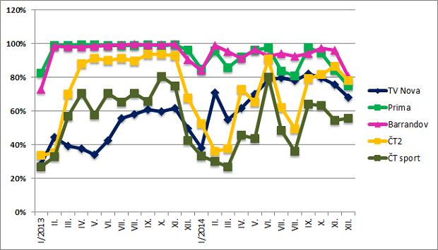 Ve srovnání s předcházejícím rokem, který byl však na trhu netypický, navýšila svou vyprodanost Nova, ke které se začali vracet inzerenti po změně obchodní politiky. Vysoká naplněnost Primy z roku 2013 se loni mírně snížila, naopak více času pro reklamní vysílání využila TV Barrandov.
