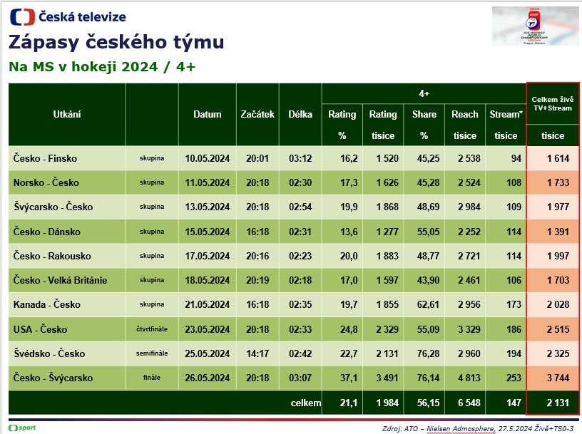 # sledovanost # TV # Česká televize # ČT sport # share # rating # hokej # MS hokej