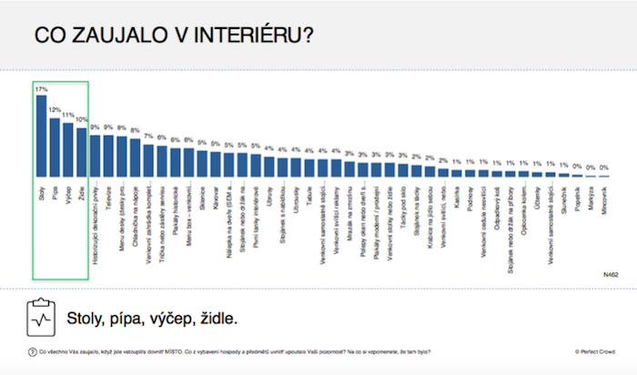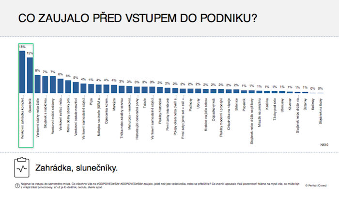 Z pohledu přilákání pozornosti, kterou zákazníci věnují jednotlivým POP médiím v HORECA, zvítězila v exteriéru zahrádka, kterou zaznamenalo 18 % respondentů online dotazování. Na zahrádce si pak 42 % z nich všimlo slunečníků a 25 % dětského koutku.