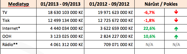 Celková ceníková hodnota reklamního prostoru ve třech čtvrtinách letošního roku oproti srovnatelnému období roku 2012 poklesla o 1,2 %. Srovnání nezahrnuje data za rádia, která jsou od letošního roku v monitoringu rozšířena o regionální kampaně, a proto meziroční porovnání tohoto mediatypu zatím není možné.
