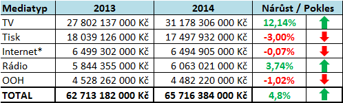 Celkový objem monitorovaných mediálních investic, určených na nákup reklamního prostoru v médiích, dosáhl v roce 2014 celkové výše necelých 66 mld. Kč. Ve srovnání s rokem 2013 to představovalo nárůst o necelých 5 %. Podle monitoringu investic společnosti Admosphere si největší nárůst připsala televize, která meziročně narostla o 12 %. V korunovém vyjádření si televizní médium polepšilo o více než 3 mld. Kč, což de facto odpovídá celkovému nárůstu monitorovaných investic v loňském roce.