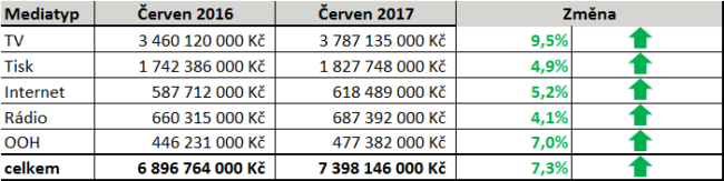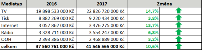 Monitoring reklamních investic určených na nákup reklamního prostoru v médiích indikuje za první pololetí 2017 nárůst o 11 procent. První pololetí mělo být z pohledu reklamní aktivity příznivé. Celkově se podle monitoringu v hrubém vyjádření vynaložilo do médií 41,5 mld. Kč, což ve srovnání s prvními šesti měsíci roku 2016 znamená navýšení o téměř 4 mld. Kč. Polepšily si přitom všechny mediatypy, nejvíce podle monitoringu rostla televizní reklama, která si připsala 15% navýšení, tj. cca 3 mld. Kč. Monitoring investic zohledňuje ceníkové ceny, nikoli reálné investice, které se od skutečných odlišují.