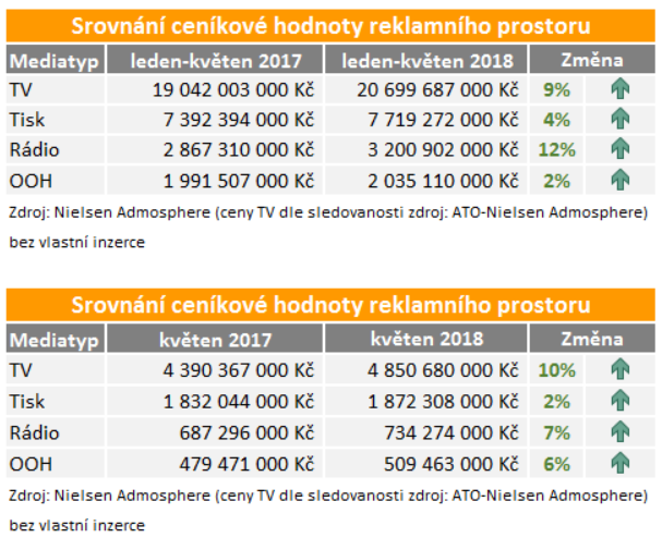 Také v pátém letošním měsíci měly být investice směřované do nákupu reklamního prostoru v médiích vyšší než ve stejném loňském období. Za prvních pět měsíců mají být podle údajů Ad Intel od Nielsen Admosphere nad úrovní loňského roku všechny mediatypy. V letošním roce se má dařit především rádiím (+12 %) a televizní reklamě (+9 %).