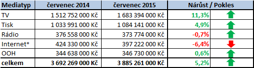 Podle monitoringu nadále pokračoval růst investic do televizní reklamy, která si ve srovnání s loňským červencem připsala o 170 mil. Kč navíc. V procentuálním vyjádření dosáhl červencový nárůst investic do televizní reklamy 11 %. Podle hrubých investic z monitoringu se dařilo i tištěným médiím (+5 %) a mírně si polepšila i outdoorová reklama. Naopak pokles zaznamenala internetová display reklama. Jde ale jen o část vývoje internetové reklamy, protože monitoring investic nepostihuje všechny její typy.