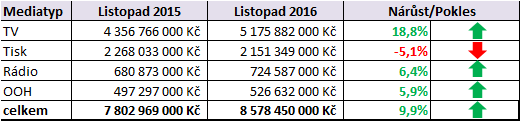 Také v listopadu pokračoval podle monitoringu Nielsen Admosphere růst hrubých monitorovaných investic do nákupu reklamního prostoru v médiích. Tentokrát se ale snížil na úroveň 10 %. V tištěných médiích registroval monitoring v listopadu 2016 pokles o 5 %. Celkově za prvních jedenáct měsíců je ale tempo investic o 14 % vyšší než za stejné období v roce 2016. Je to dáno růstem investic do televizní reklamy o 19 %, což představuje meziroční zvýšení o více než 6 mld. Kč.
