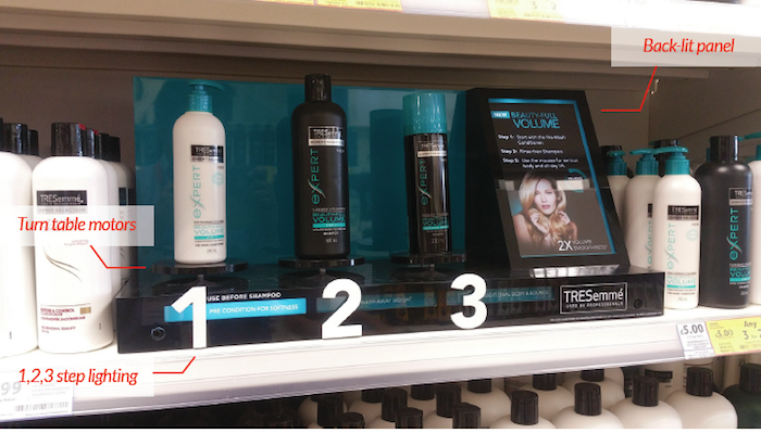 Další důkaz pozitivního vlivu osvětlených POP médií přinesla v roce 2016 britská studie asociace POPAI UK, Rocket Production a Unileveru zkoumající podporu prodeje vlasových produktů značky TRESemmé. Produkty byly nejdříve jen běžně vystaveny v regálu, následně zvýrazněny statickým POP médiem, poté doplněny světlem, později také pohybovým a zvukovým efektem. Podsvícený displej dokázal přilákat zrak o 34 % nakupujících více, než ten nesvětelný. Díky podsvíceným prvkům displeje, označujících jednotlivé kroky vlasové péče, strávili zákazníci u výrobků o 215 % déle času. Deklarovaný zájem o koupi produktů v displaji stoupl o 23 %. U exekuce s aplikovaným světelným efektem stouply prodeje o 122% oproti shodné exekuci bez světelného efektu. Přidáním dalších stimulů – pohybu a zvuku – schopnost přilákat zákazníky ještě vrostla, prodeje se vlivem jejich kombinace zvedly dokonce o 137 %.