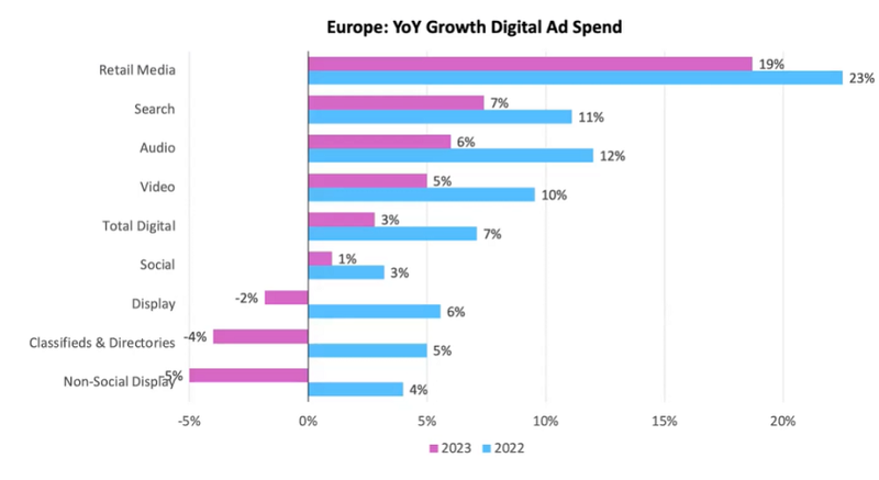 Pohled na jednotlivé kanály digitální reklamy pak ukazuje na významný růst retailových médií (+19 %) i v příštím roce. Podle hlavního ekonoma IAB Europe, Daniela Knappa, se očekává rychlejší růst investic do retailových médií, než bude vývoj v celé e-commerce, která naopak po covidovém růstu zpomaluje. Relativně příznivý vývoj je předvídán ještě vyhledávání, audio a video reklamě. Naopak citelně zpomalují investice do sociálních médií (pro r. 2023 odhadováno jen procentní zvýšení) a pokles má zaznamenat display.