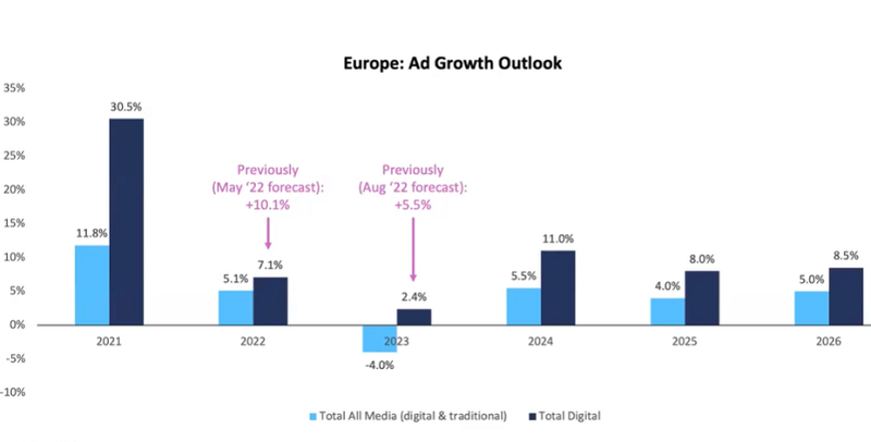 Organizace IAB Europe snížila výhled dynamiky reklamních investic v digitálu pro letošní rok a především pro rok 2023. Podle nového odhadu, který zveřejnila ve čtvrtek, očekává v letošním roce meziroční růst reklamních investic do digitální reklamy o 7,1 %, když ještě v květnu předpovídala 10% růst. V příštím roce by měly investice do digitální reklamy vzrůst pouze o 2 %. V případě roku 2023 se odhad růstu snížil z květnových 5 %.