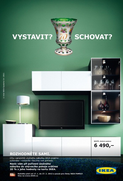 Nová kampaň společnosti IKEA se sloganem „Vystavit? Schovat? Rozhodněte sami.“ podporuje nabídku úložného nábytku BESTÅ do obývacího pokoje. Komunikace z dílny agentury Kaspen/Jung von Matt, která vznikla ve spolupráci s maďarskou agenturou Well, se zaměřuje na variabilitu nábytku, díky níž se každý může rozhodnout, co si nechá vystavené nebo skryje za dvířka úložné sestavy.