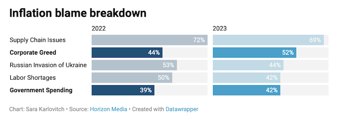 Korporace viní z inflace meziročně o 8 pb. více spotřebitelů – ze 44 % v roce 2022 vzrostl tento počet na letošních 52 %. Právě hamižnost korporací je v očích spotřebitelů druhým největším viníkem inflace, před ní stojí podle dotázaných už jen problémy na straně dodavatelských řetězců (69 %), za ní pak ruská invaze na Ukrajinu (44 %), nedostatek pracovních sil (42 %) a vládní výdaje (42 %)