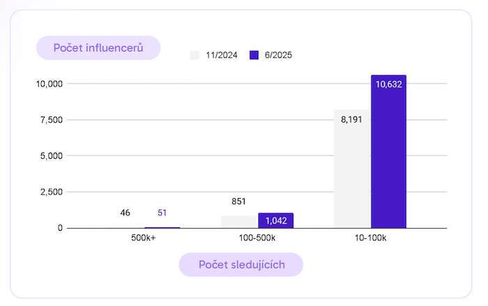 Počet influencerů se mezi listopadem 2024 a červnem 2025 zvýšil o téměř 30 %. Nejvíce rostl segment s 10 až 100 tisíci sledujícími, kde se počet profilů navýšil o více než 2400. Mezi nově příchozí do klubu s více než 500 tisíci sledujícími patří například tvůrci cikindeles, ifbb_pro_michalkrizokrizanek či tehotnejkuchar.