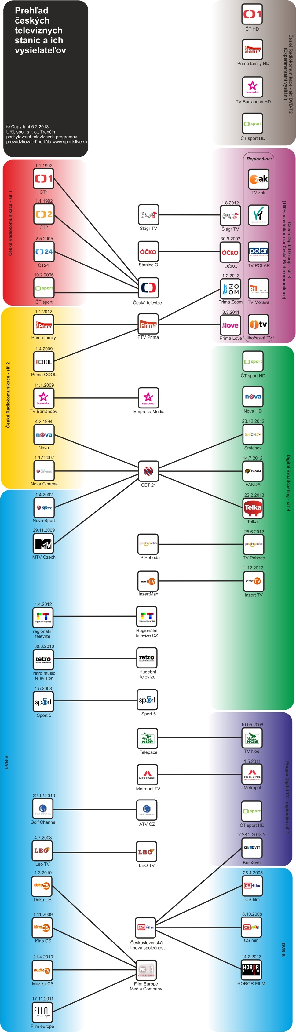 Přehled o tom, jaké televizní kanály a kterých provozovatelů vysílají v jakém multiplexu, připravila trenčínská společnost URI. Infografika je zpracovaná pro český i slovenský trh, a to včetně satelitního vysílání. Společnost chystá přehled i o dalších zemích střední a východní Evropy.