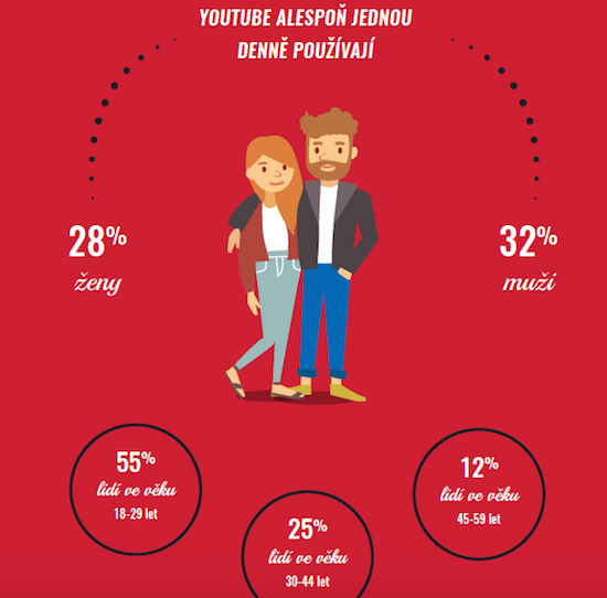 Podobně je na tom také sociální síť YouTube, zde jsou ovšem aktivnější pro změnu muži. Třetina z nich (32 %) si zde prohlíží videa alespoň jednou denně, u žen je číslo o 4 procenta nižší.