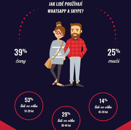 V aplikacích WhatsApp a Skype jsou mnohem aktivnější ženy (39 %) než muži (25 %). Obecně je na těchto chatovacích aplikacích opět nejaktivnější skupina lidí ve věku 18–29 let (53 %), s přibývajícím věkem zájem klesá. Aplikace používá 29 % lidí ve věku 30–44 let a pouze 14 % lidí ve věku 45–59 let.