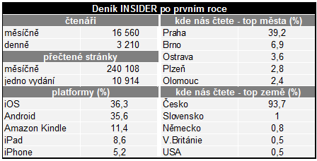 Insider v současnosti registruje téměř 1400 předplatitelů, denní čtenost přesahuje 3 tisíce čtenářů. „Blížíme se k polovině z 2800 aktivních předplatitelských účtů, což byl dlouhodobý a veřejně prezentovaný plán úvodní fáze projektu. Po prvním roce existence je to nad očekávání dobrý výsledek,“ řekl dále Unger.