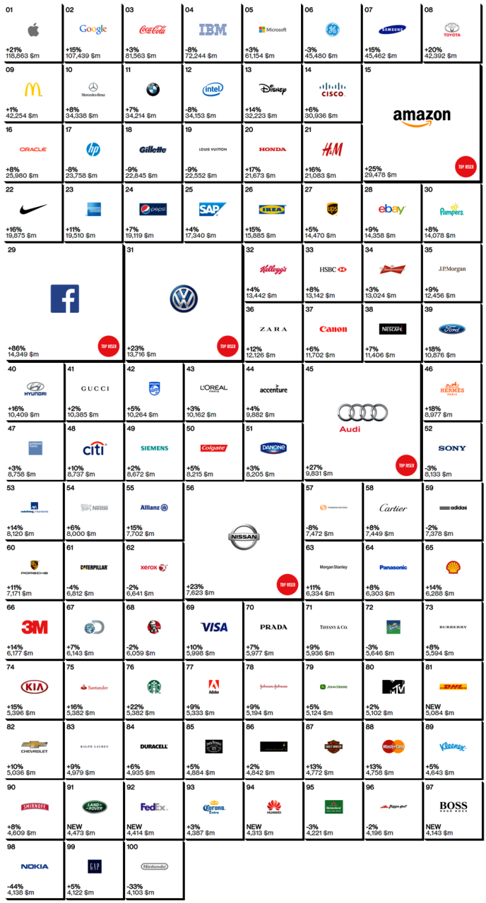 Letos poprvé v historii překročily dvě značky svou hodnotou hranici 100 miliard dolarů. Hodnota značky Apple se meziročně zvýšila o 21 % na 118,9 mld. dolarů, Google vzrostl o 15 % na 107,4 mld. dolarů.