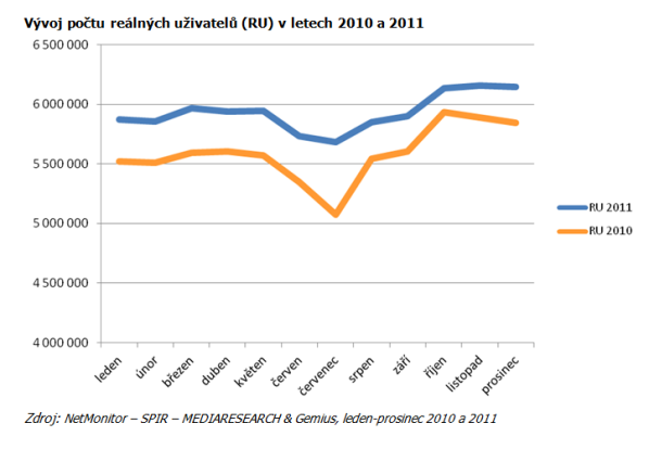 Počet českých uživatelů internetu se podle výsledků NetMonitoru v druhé polovině roku 2011 vyšplhal na šest milionů a zatím se drží. Internet v roce 2011 zaznamenal o něco stabilnější vývoj než v roce předchozím. Zatímco v červenci 2010 se počet reálných uživatelů (RU) internetu znatelně propadl, v létě 2011 se obvyklé sezónní vlivy tolik neprojevily. V říjnu se pak počet RU vyhoupl nad 6,135 milionů a do konce roku v šestimilionových číslech vytrval.