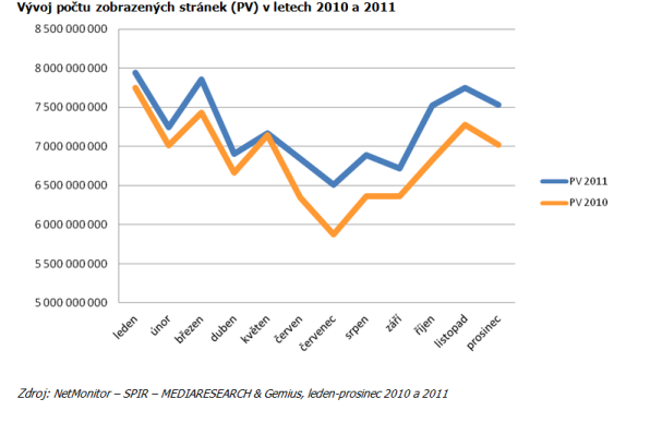 Z hlediska vývoje počtu zobrazených stránek (PV) můžeme mluvit o shodném trendu obou let, v druhé půli roku se však meziroční rozdíly mírně zvětšily. Průměrně se oproti roku 2010 zvýšil měsíční počet zobrazených stránek o více než 5,5 %.