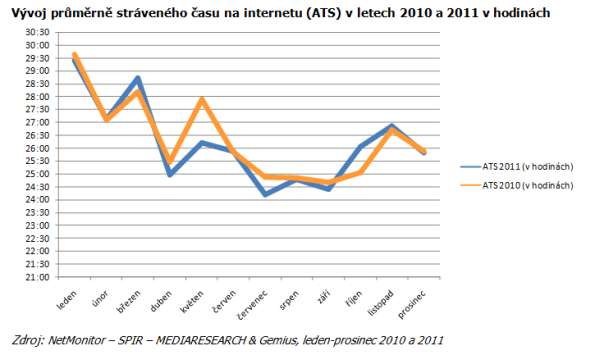 Přestože počet zobrazených stránek meziročně vzrostl, vývoj počtu průměrně stráveného času na internetu (ATS) se v loňském roce od roku 2010 zásadně nelišil. V průměru došlo k mírnému poklesu měsíčně stráveného času na internetu o devět minut. Stagnaci ATS lze vysvětlit tím, že přestože aktivita uživatelů na internetu vesměs roste, uživatelé tráví nezanedbatelný čas na webech, které v tuto chvíli nejsou měřeny NetMonitorem (např. facebook.com nebo youtube.com).