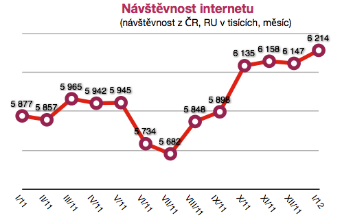 Návštěvnost internetu dosáhla v letošním lednu 6,214 reálných uživatelů měsíčně (návštěvnost z ČR), což bylo o téměř 340 tisíc návštěvníků více než v lednu roku 2011 (+6 %). Letošní lednová návštěvnost tak pokračuje v rostoucím trendu. Počet zhlédnutých stránek překročil v letošním lednu 8,5 milionu – o 600 tis. více než ve stejném měsíci o rok dříve.