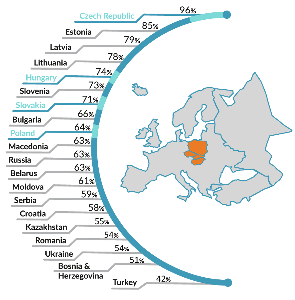 Internet v Česku navštěvuje 96 % osob ve věku 18–69 let, čímž je internetová penetrace u nás nejvyšší mezi všemi státy regionu střední a východní Evropy (CEE). V dalších státech V4 se míra rozšíření internetu pohybuje přibližně mezi 65 až 75 % a průměr celého regionu střední a východní Evropy činí 67 %. Tyto údaje vyplývají ze studie Online Landscape: Central Europe společnosti Gemius, která analyzuje situaci internetových trhů v jednotlivých státech V4.