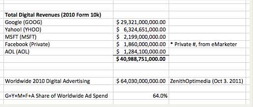 Hlavní internetoví hráči jako Google, Facebook nebo Yahoo! ovládají většinu světových reklamních investic, které jsou určeny právě na internet. Vyplývá to z porovnání vykázaných tržeb z digitálních médií ve srovnání s celosvětovým odhadovaným objemem vynaloženým na internetovou reklamu.