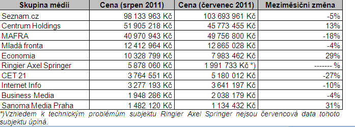 Podle výsledků výzkumu AdMonitoring, který monitoruje výdaje do internetové display reklamy, se v srpnu 2011 do online reklamy investovalo v ceníkových cenách celkem 272 milionu korun. Meziměsíčně se jedná o pokles o 2,16 %.