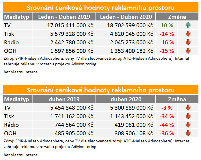 V přehledu není uveden vývoj v internetové reklamě, protože monitoring postihuje jen display reklamu a video reklamu. Ta se podle dat AdMonitoringu v dubnu ve srovnání s letošním březnem snížila zhruba o třetinu.