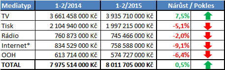 Za první dva měsíce letošního roku registruje monitoring investic spíše stagnaci mediálních investic (+0,5 %). Nejlépe si podle monitorovaných cen vede televizní reklama.