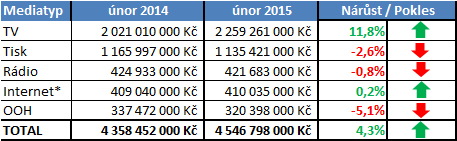 Vývoj hrubých výdajů na reklamu v médiích v letošním únoru se podle ceníkových cen ve srovnání s lednem vylepšil a v souhrnu dosáhl 4,55 mld. Kč. To představovalo meziroční 4% nárůst. Nejvýrazněji se na tomto výsledku odrazila televizní reklama, která v hrubých cenách meziročně v únoru rostla o 12 %. Představovalo to meziroční nárůst o téměř 240 mil. Kč. Vyplývá to z dat společnosti Admosphere. Podle monitoringu v únoru zároveň stagnovala internetová display reklama a rádiová reklama, mírně pak rostla outdoorová reklama.