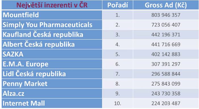 Celkový objem hrubé inzerce v tisku podle monitoringu v roce 2021 činil 19,556 mld. Kč, což bylo o téměř 14 % více než v roce 2020. Objem hrubých inzertních výkonů se tak v tisku dostal na úroveň srovnatelnou s obdobím před pandemií (19,8 mld. Kč). Největším inzerentem v tištěných titulech byla společnost Mountfield před firmami Simply You Pharmaceuticals, Kaufland, Albert a Sazka. Data vycházejí z monitoringu Nielsen Admosphere a byla prezentována na čtvrtečním setkání Unie vydavatelů, které se uskutečnilo při příležitosti zveřejnění výsledků čtenosti Media projektu za 3. a 4. loňské čtvrtletí.