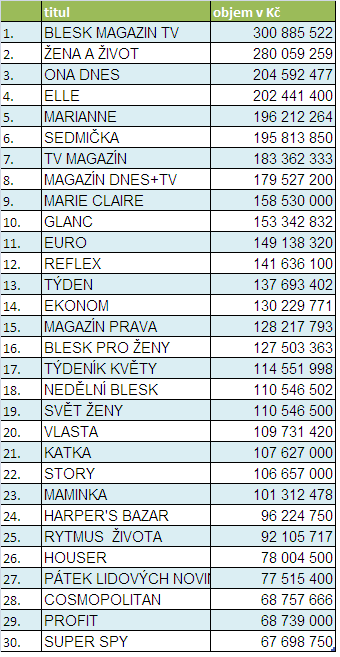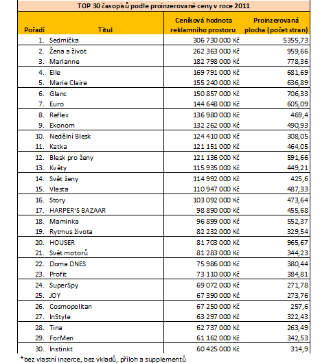 Podle srovnání ceníkové hodnoty reklamního prostoru jednotlivých titulů bez vlastní inzerce se na prvním místě žebříčku umístil týdeník Sedmička. Ten je však vzhledem k formátu a konceptu spíše novinovým titulem.