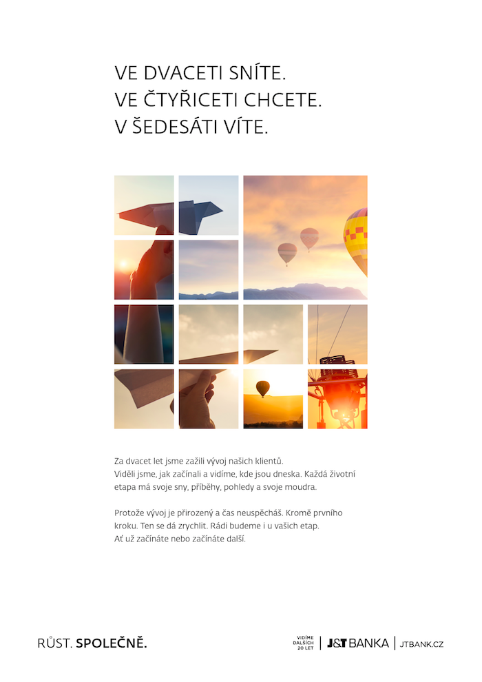 J&T Banka je privátní bankou, jež si zakládá na své exkluzivitě a osobním kontaktu s klientem. Od 1. října však spouští také nadlinkovou kampaň, v níž představuje svůj nový slogan: „Růst. Společně.“ K vidění bude nejen v tisku a na internetu, ale poprvé také v outdooru. „J&T je bankou, kterou lze přirovnat k luxusním módním značkám v Pařížské. Jen místo luxusního zboží nabízí bankovní služby. I proto bude její komunikace vždy prémiová a vybíravá,“ popisuje marketingový ředitel společnosti Martin Hošek.