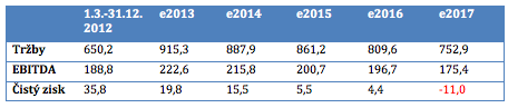 Kombinace klesajících tržeb a fixních nákladů na finanční úrovni má vést ke klesajícímu čistému zisku, který by se mohl v roce 2017 dostat do ztráty, odhaduje banka. Návrat k čistému zisku očekává až v dalších letech, kdy dojde ke snížení zadlužení (částečnému splacení a refinancování emisí 2017-2019). „Nízký až záporný čistý zisk do roku 2017 je však z velké části dán odpisy (80-90 mil. Kč ročně) a neodráží proto hotovostní toky ve firmě,“ uvádí J&T Banka.