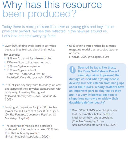 Na svých stránkách dokonce Dove nabízí „Self-esteem guide“ s radami, jak správně hovořit s dospívajícími dívkami a napomáhat tak posilování jejich sebeúcty, aby se jejich představy o vlastní kráse nestaly překážkou k zapojení se do různých aktivit, jako je plavání ve veřejném bazénu nebo zapojení se do sportovního týmu.