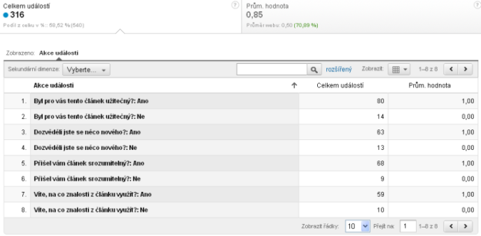 Zmíněný dotazník spokojenosti si samozřejmě měříme. Za první měsíc známe vyhodnocení odpovědi na otázku “Byl pro vás tento článek užitečný?”. Je to pro nás hodnota 85 %. V prvním týdnu byla tato hodnota dokonce jen 74 %, nejspíše protože jsme na web posílali i uživatele, kteří se o webovou analytiku zajímají a texty se jim tedy mohly zdát příliš začátečnické.