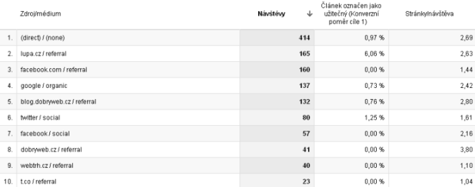 Pro projekt jsme nepřipravovali žádnou nákladnou propagaci, kterou by čtenáři MediaGuru mohli očekávat. Dali jsme vědět čtenářům blogu Dobrého webu, čtenářům Lupa.cz, přes několik kolegů jsme informaci o spuštění šířili po Twitteru a Facebooku. Jeden z takovýchto přehledů nám dává alespoň základní zpětnou vazbu, které zdroje přivádějí pro nás zajímavou návštěvnost, která bude na webu spokojena.