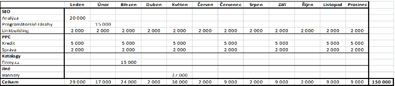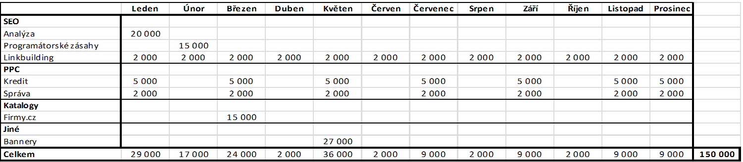 Udělejte si měsíční rozpočet a naplánujte si konkrétní výdaje podle jednotlivých měsíců a rozložení investic v typech internetové propagace. Uvědomte si, že některé oblasti vyžadují investici předem a jiné platíte až po realizaci reklamní kampaně.