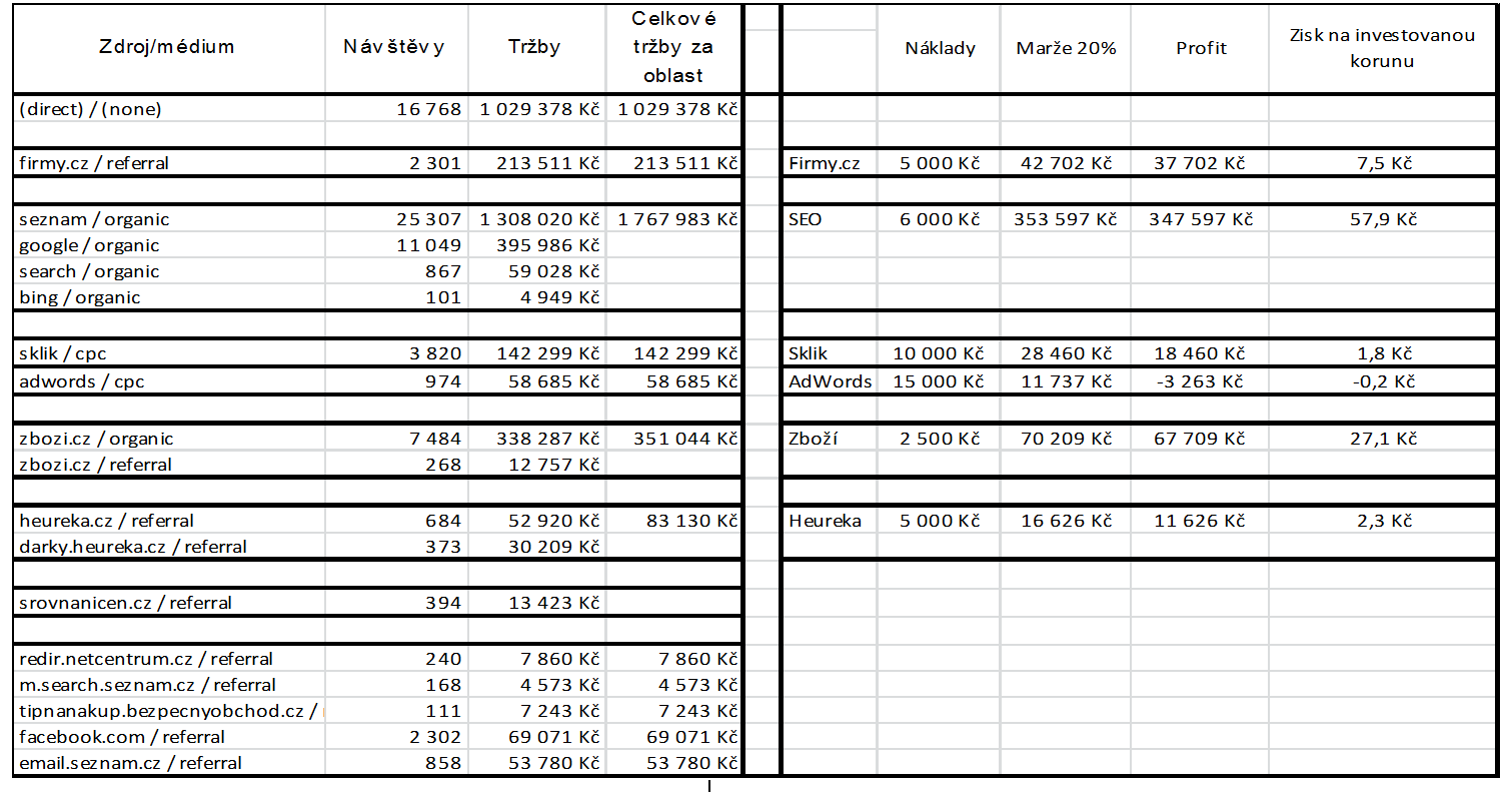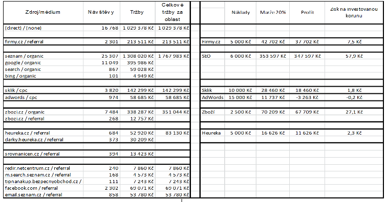 Dostali jste se tedy k informaci, jaký zdroj reklamy vydělal jaký obrat, a vyhodili vše, co nebude potřebovat. Teď k tomu připojte informaci o nákladech – tedy ceně, kterou jste za reklamu zaplatili. Získáte tabulku (pozn. kompletní verze - rozkliknutím zvětšíte):