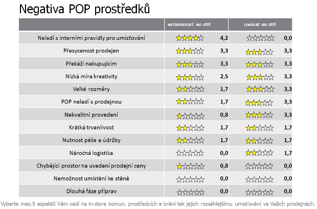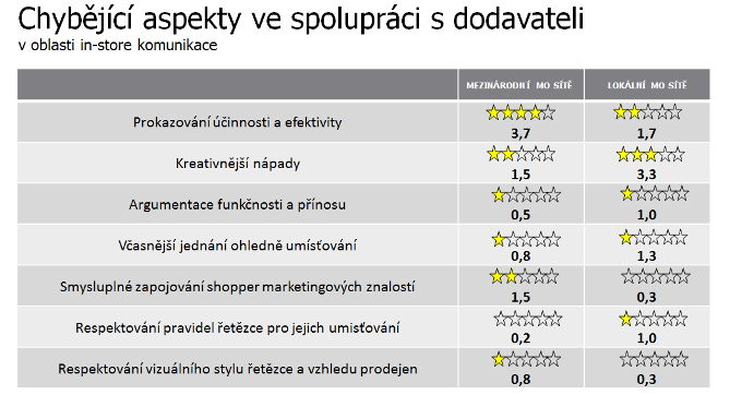 V oblasti spolupráce s dodavateli v in-store mezinárodním sítím naopak chybí prokazování účinnosti a efektivity POP prostředků, lokální sítě postrádají kreativní nápady.