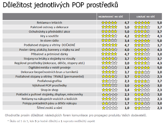 Pro mezinárodní sítě jsou nejsilněji vnímaným komunikačním POP prostředky jednak paletové ostrovy a dekorace, jednak ochutnávky a předváděcí akce. Z diskuze vzešlo, že jejich prvenství je dáno jejich propojením s promoakcemi a slevovými pobídkami.