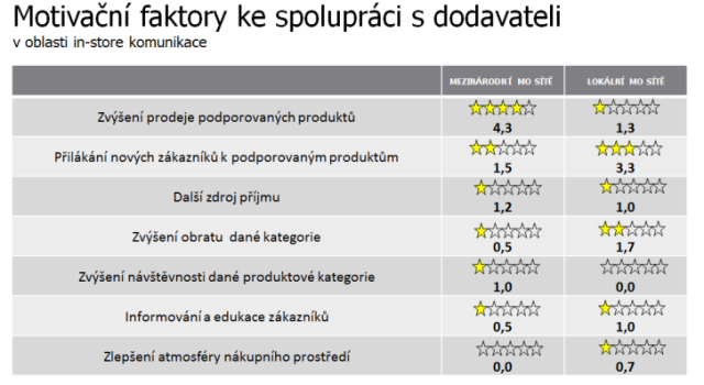 Zatímco hlavním motivačním faktorem pro spolupráci s dodavateli v in-store je pro mezinárodní sítě zvýšení prodeje podporovaných produktů, lokální sítě chtějí především přilákat nové zákazníky. To potvrzuje často zmiňované strategie lokálních maloobchodníků, v jejichž centru je zákazník, zatímco mezinárodní řetězce mají za primární cíle ekonomické ukazatele.
