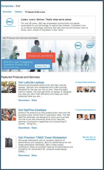 Respondenti zmíněné studie uvedli, že za velmi užitečnou považují záložku „Products and Services“, kde je k vidění mimo jiné i doporučení zákazníků. Proto je výhodné ukazovat ty nejlepší a nejoceňovanější produkty například v sekci „Product and Service Spotlight“ a vybízet uživatele k poskytování zpětné vazby. Velmi dobře s tím pracuje například společnost Dell, která zde uvádí více než 40 produktů se 300 zákaznickými doporučeními.