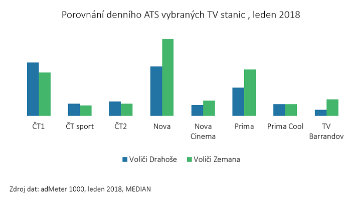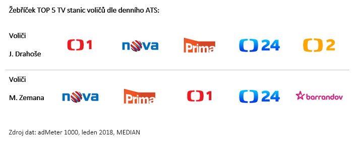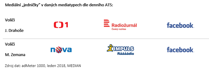 Výzkumná agentura Median provedla v lednu průzkum volebních preferencí v rámci crossmediálního měření adMeter 1000, ze kterého vyplývají zajímavé rozdíly v mediální konzumaci mezi voliči Miloše Zemana a Jiřího Drahoše. Voliči obou kandidátů sledují hlavní média (ČT, TV Nova, Prima, ČRo Radiožurnál, Rádio Impuls, facebook,Seznam.cz) přibližně stejným způsobem, liší se však čas věnovaný jejich sledování (ATS).