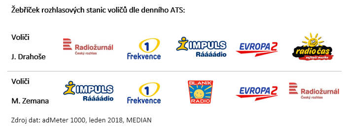 Mezi rozhlasovými stanicemi se drží na stabilním druhém místě Frekvence 1 mezi všemi voliči. První místo mezi voliči Drahoše v žebříčku podle denního ATS (průměrného stráveného času) zaujímá ČRo Radiožurnál, poslouchaný v průměru čtvrthodinu denně. Mezi voliči Zemana vede Rádio Impuls poslouchané o 32% déle, v průměru 19 minut denně.