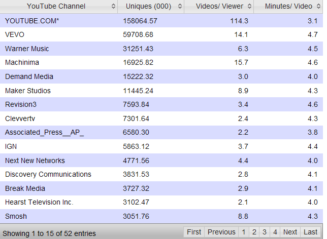 Společnost ComScore začala zveřejňovat data o partnerských kanálech YouTube. Vyplývá z nich, že nejvyhledávanější kategorií na YouTube jsou hudební videa, která si v červenci vyhledalo 40 % uživatelů.