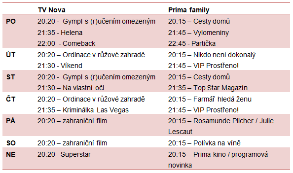 Nové budou také pondělní večery, kde se proti sitcomu Helena postaví nový pořad Prima family Vylomeniny s Martinem Dejdarem a Tomášem Měcháčkem. Sobotní večer pak Prima family zkusí obsadit novým formátem, když místo tradičního filmu nabídne novou talk show Bolka Polívky. Ta tak půjde proti zahraničním filmovým snímkům na TV Nova.