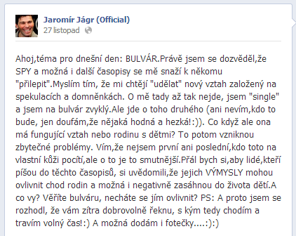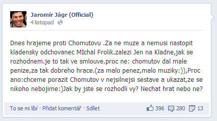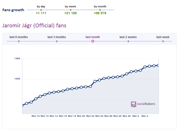 Svůj oficiální profil na Facebooku má Jaromír Jágr už delší dobu, ale až začátkem listopadu se do toho opravdu položil, což si mnozí vysvětlují tím, že se o komunikaci začal starat sám. Od té doby počet jeho fanoušků vzrostl z 20 tisíc na 133 tisíc, přičemž jeho statusy pravidelně získávají několik stovek až tisíc lajků.